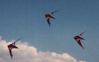 --Ca y est celui là va tout gâcher avec son rock and roll ! Deux minutes de discussion montage du 2ème cv identique au premier.L'attention du spectateur s'attarde sur le dessin de la voile , le motif rappelle vaguement une fleur le regard se satisfait du choix des couleurs....harmonieuses, tout en courbes, rien à voir avec les tons criards vaguement entrevus lors de la saison estivale !... Le magnétophone est mis en marche , aux premières notes les deux ailes s'élèvent, se croisent et se décroisent partent sur des figures symétriques en rythme.
